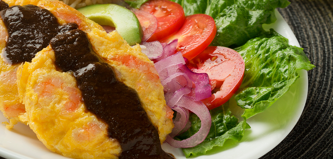 6. Por último servir en el plato el arroz a las tortitas de camarón y bañarlas con mole de su elección.