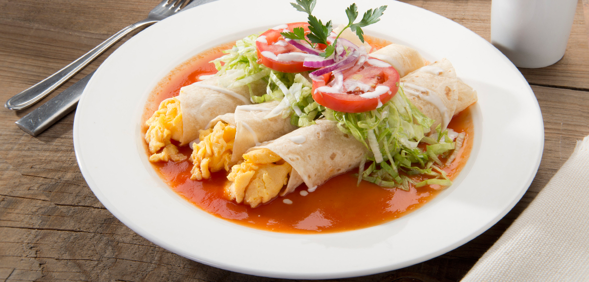 Calentar el aceite en un sartén. Lavar y desinfectar las verduras. Agregar los huevos batidos en lasartén, sazonar con sal al gusto y mover constantemente hasta obtener la cocción deseada y reservar tapado. Calentar el caldillo hasta el hervor, retirar del fuego y reservar tapado. Calentar las tortillas y rellenarlas para formar los burritos. Colocar un poco de caldillo de jitomate sobre el plato e inmediatamente servir los burritos de huevo. Colocar encima la lechuga con el jitomate y decorar con la cebolla, la crema y una ramita de perejil.